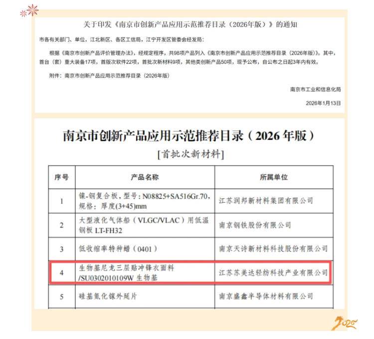 近日,从南京市工业和信息化局传来喜讯,苏美达轻纺公司旗下江苏苏美达轻纺科技产业公司研发的生物基尼龙三层贴冲锋衣面料成功入选南京市创新产品应用示范推荐目录名单,这是轻纺公司在绿色环保面料研发领域的又一成果。